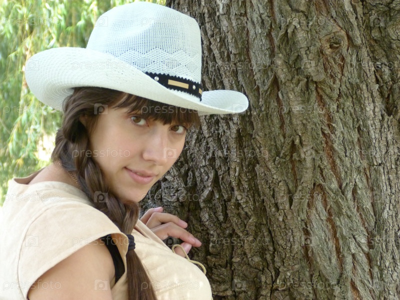 Девушка в шляпе позирует у дерева