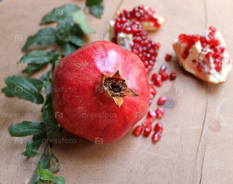 Спелые сочные плоды граната на деревянный стол с листьями