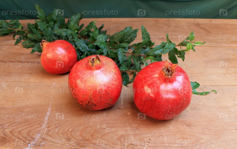 Спелые сочные плоды граната на деревянный стол с листьями