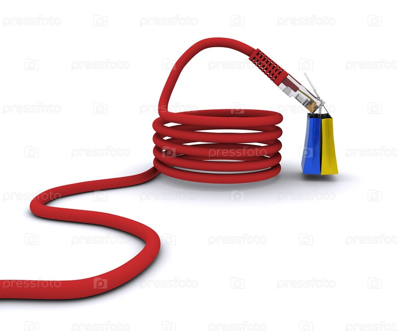 Покупки через интернет. шнур питания держит пакеты из магазина