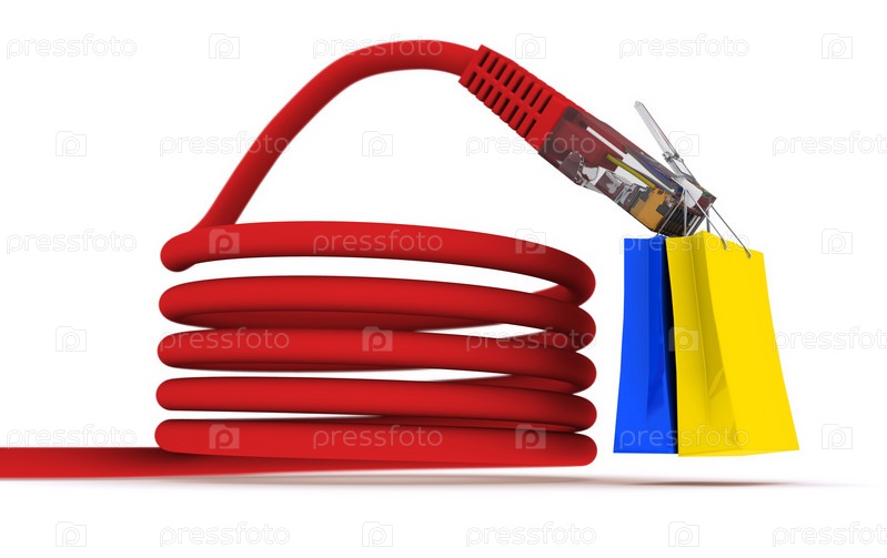 Покупки через интернет. шнур питания держит пакеты из магазина