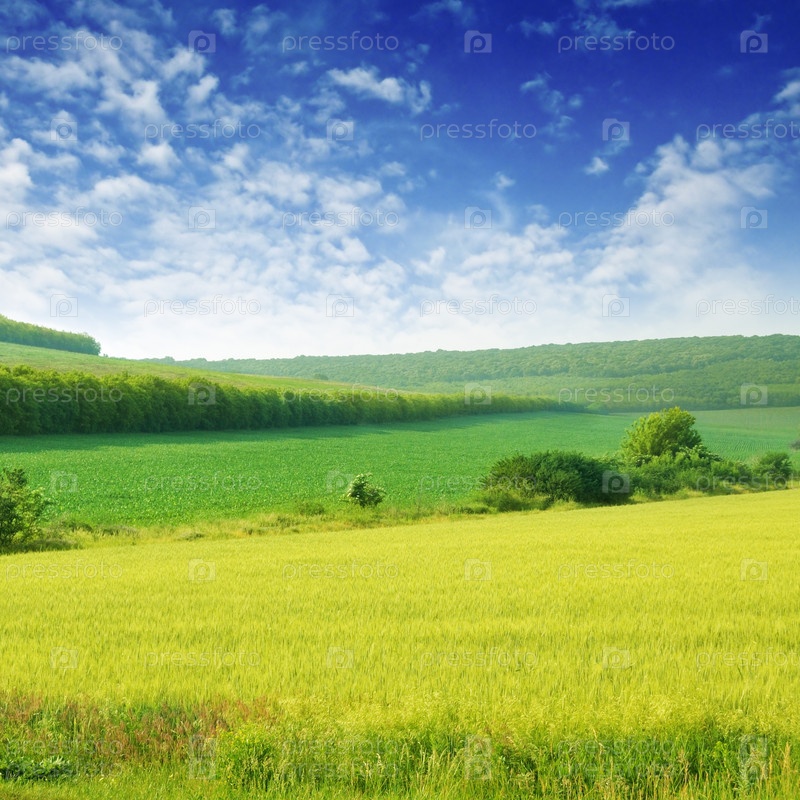 Зеленый луг и красивое голубое небо