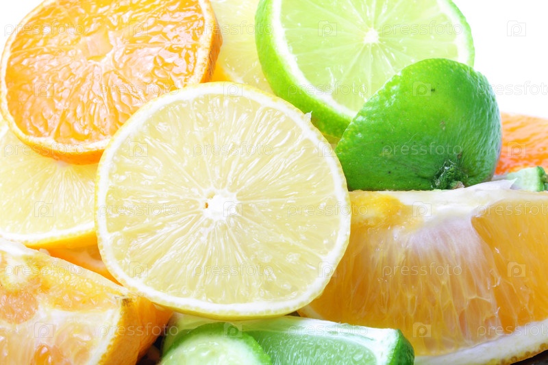 Свежие спелые фрукты (лимон, мандарин, лимон) на белом фоне (изолированные)