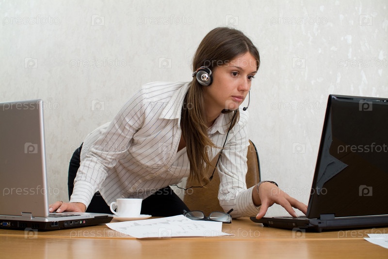 Девушка с гарнитурой работает за двумя ноутбуками в офисе