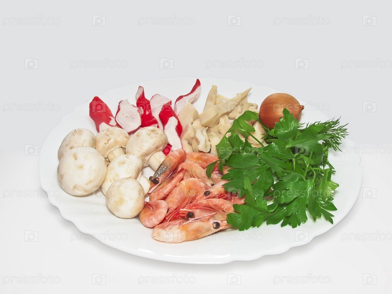 Ингредиенты салата из морепродуктов на тарелке