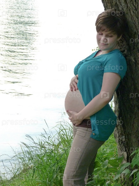 Беременная женщина стоит прислонившись к дереву