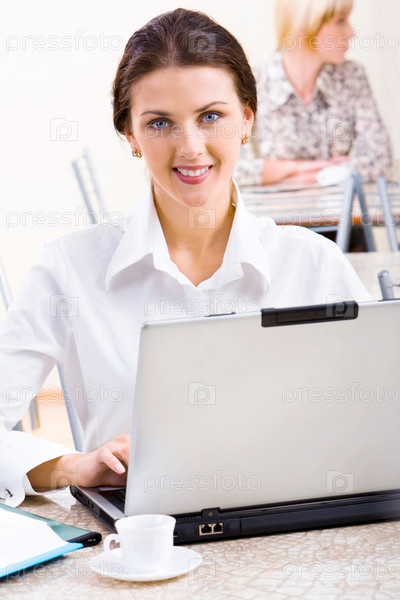 Красивая юная улыбающаяся женщина работает в кафе