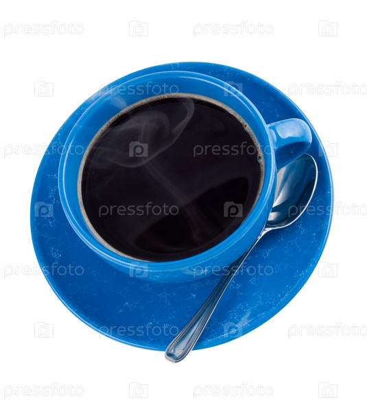 Чашка горячего черного кофе с блюдцем и ложкой на белом фоне