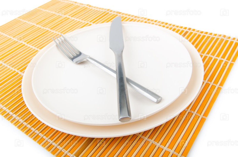 Тарелки, вилка и нож на бамбуковой салфетке