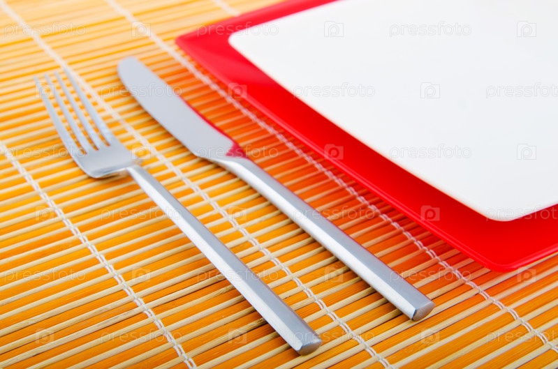 Тарелки, вилка и нож на бамбуковой салфетке