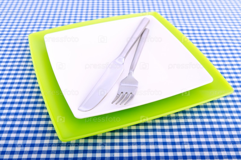 Тарелки, вилка и нож на клетчатой салфетке