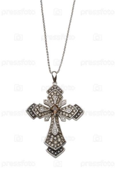 Золото христианский крест на цепи с драгоценностями на белом фоне