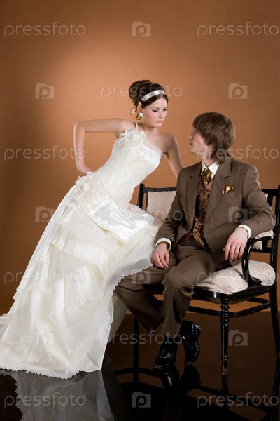 Молодая женщина и мужчина в свадебной одежде