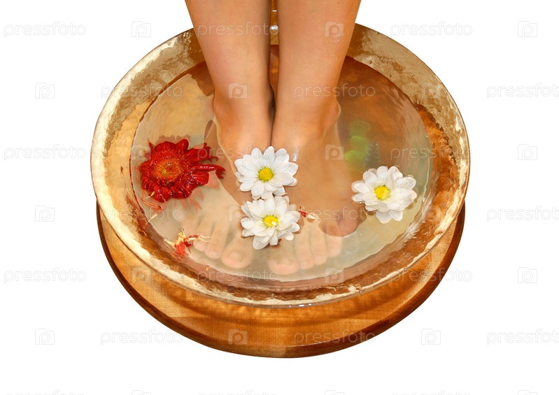 Женские ноги в тазу с водой и цветами