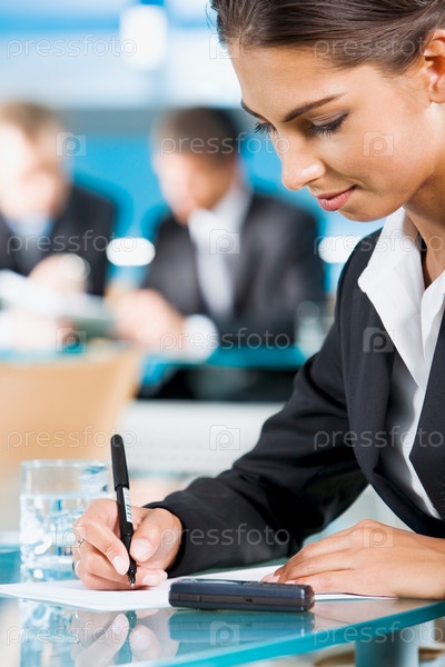 Портрет ответственной женщины, держащей черную ручку