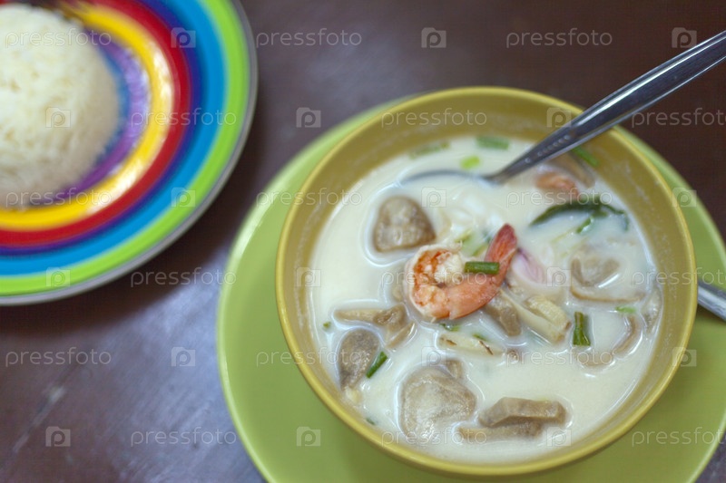 Чаша с супом из морепродуктов, пряные тайские блюда