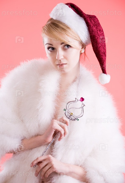 Молодая девушка в костюме снегурочки с волшебной палочкой на розовом фоне