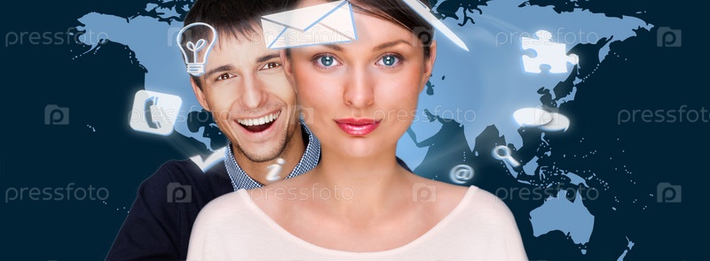 Молодые люди на фоне материков и вокруг них летают иконки