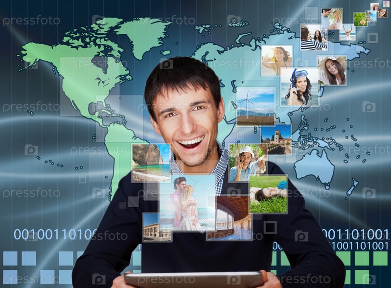 Молодой человек на фоне материков, а вокруг него летают фотографии из его планшетного компьютера