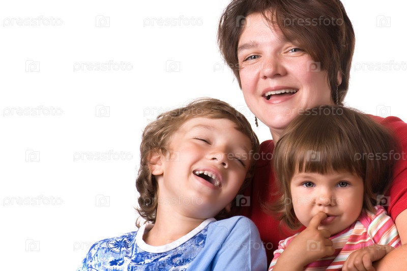 Портрет счастливой матери с детьми на белом фоне