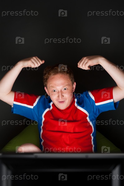 Парень-фанат болеет за сою команду по телевизору