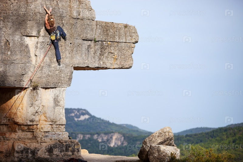 Молодая женщина, восхождение сложный маршрут на скале