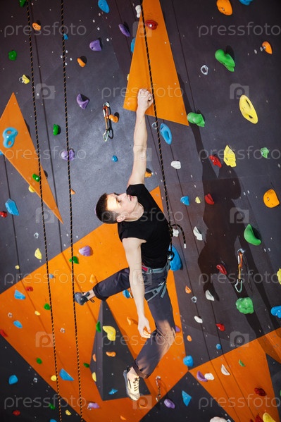 Молодой человек практикующих скалолазание в скалолазание тренажерный зал в помещении