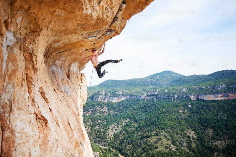 Молодой человек, поднимаясь выступе скалы, на сложной частью маршрута