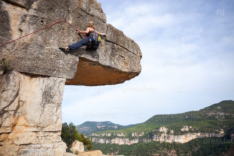 Молодая женщина, восхождение сложный маршрут на скале