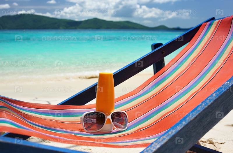 Солнцезащитный лосьон и очки на шезлонге