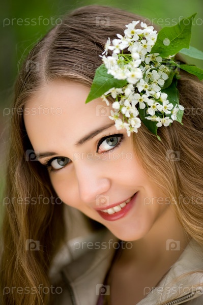 Красивая девочка-подросток с цветами в волосах в летнем парке