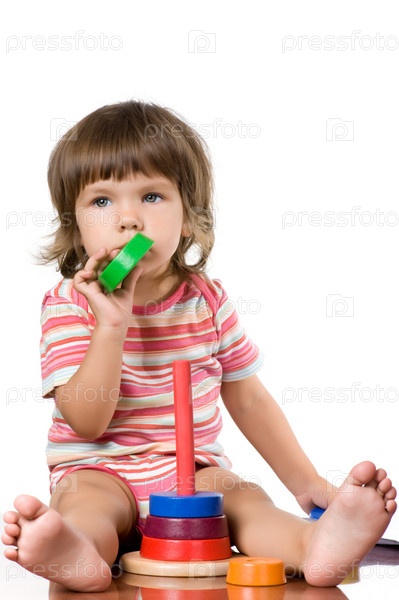 Маленькая девочка с игрушечной пирамидой. Изолированная на белом фоне