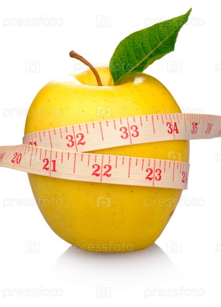 Желтое яблоко с сантиметром на белом фоне