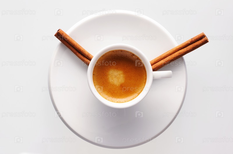 Чашка кофе и палочки корицы на блюдце