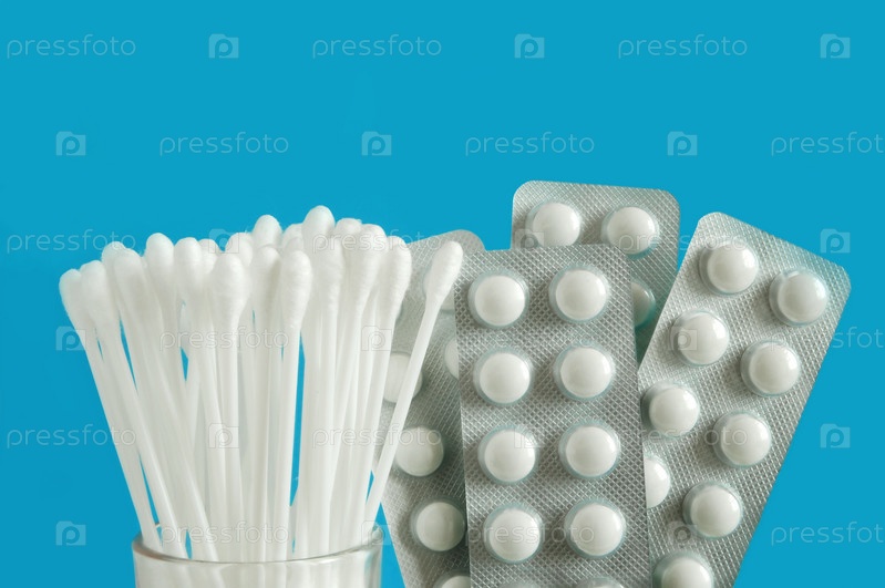 Упаковки с таблетками на синем фоне