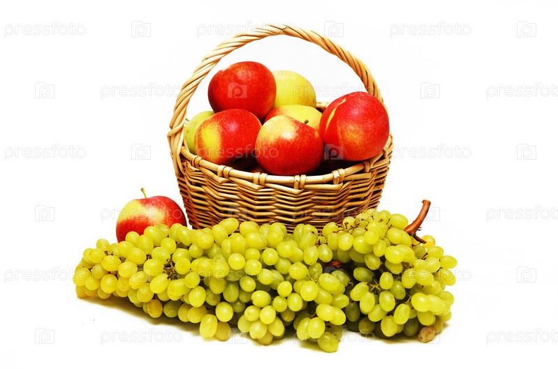 Виноград и корзина яблок на белом фоне