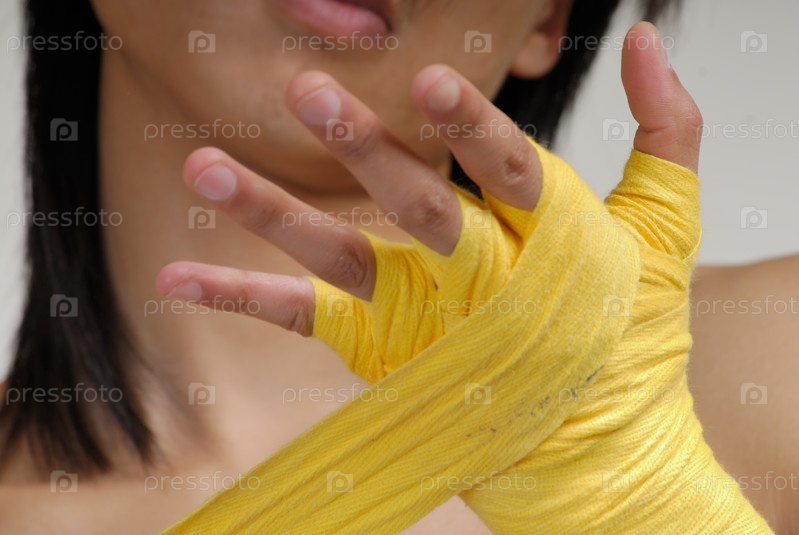 Мужчина обматывает руку эластичным бинтом крупным планом