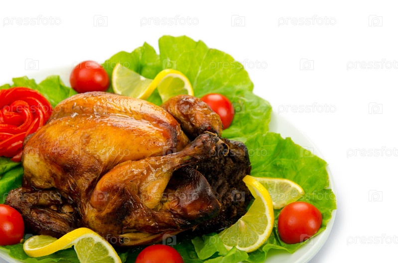 Жареная индейка с овощами и зеленью на белом фоне