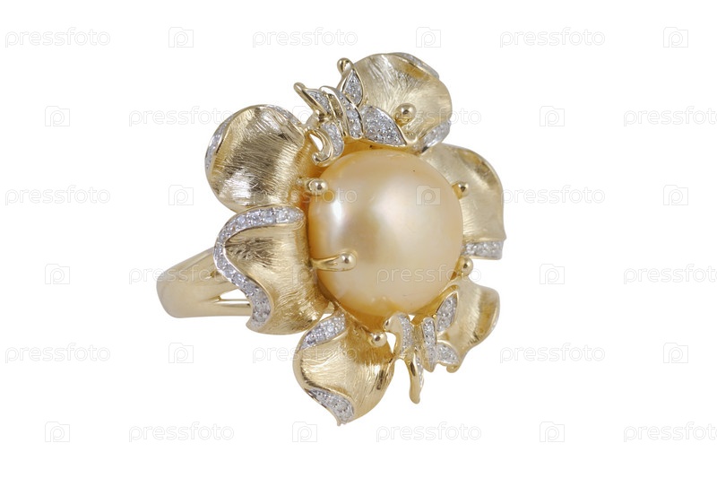 Золотое кольцо с жемчугом на белом фоне