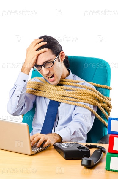Бизнесмен, привязанный к рабочему креслу