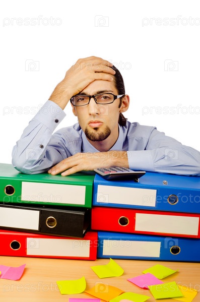 Бизнесмен сидит за столом перед стопкой папок и кучей стикеров, изолированный на белом фоне