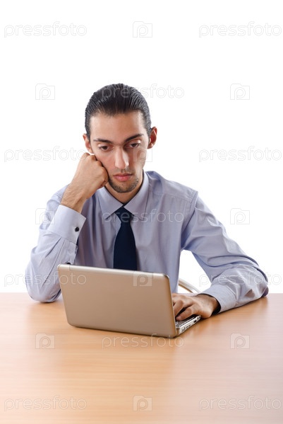 Бизнесмен работает на ноутбуке, изолированный на белом фоне
