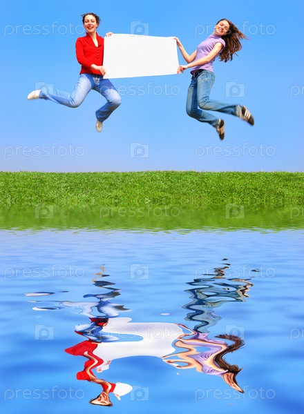 Молодые люди прыгают с плакатом на открытом воздухе