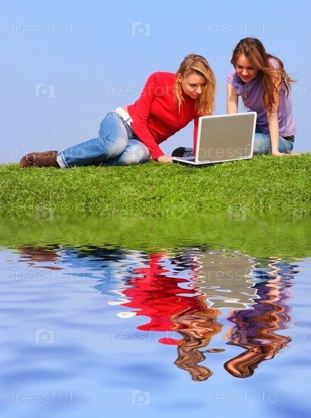 Девушки с ноутбуком на открытом воздухе у воды