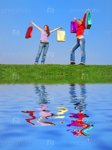 Девушки с яркими пакетами на открытом воздухе