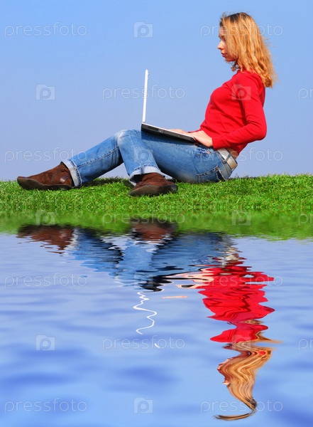 Девушка с ноутбуком на открытом воздухе у воды