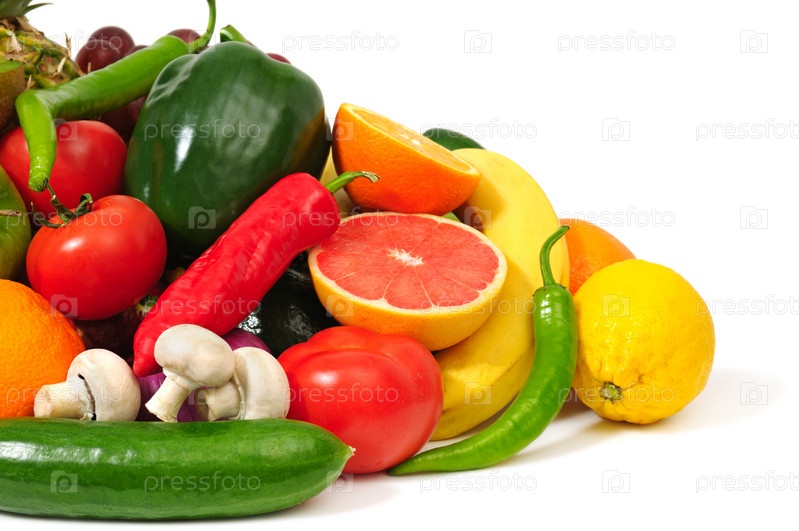 Фрукты и овощи на белом фоне