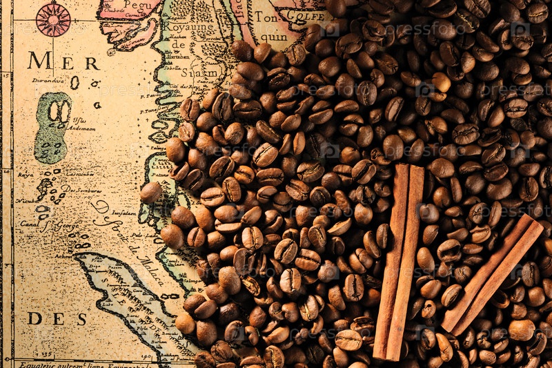 Кофейные зерна и палочки корицы на карте