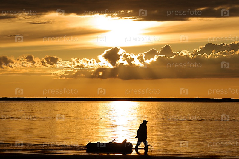 Силуэт мужчины с лодкой на морском побережье