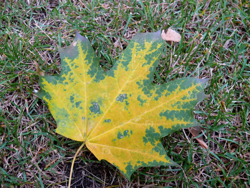 Желтый кленовый лист на траве